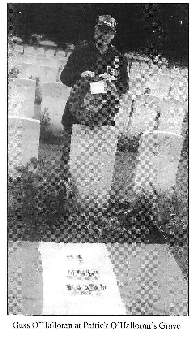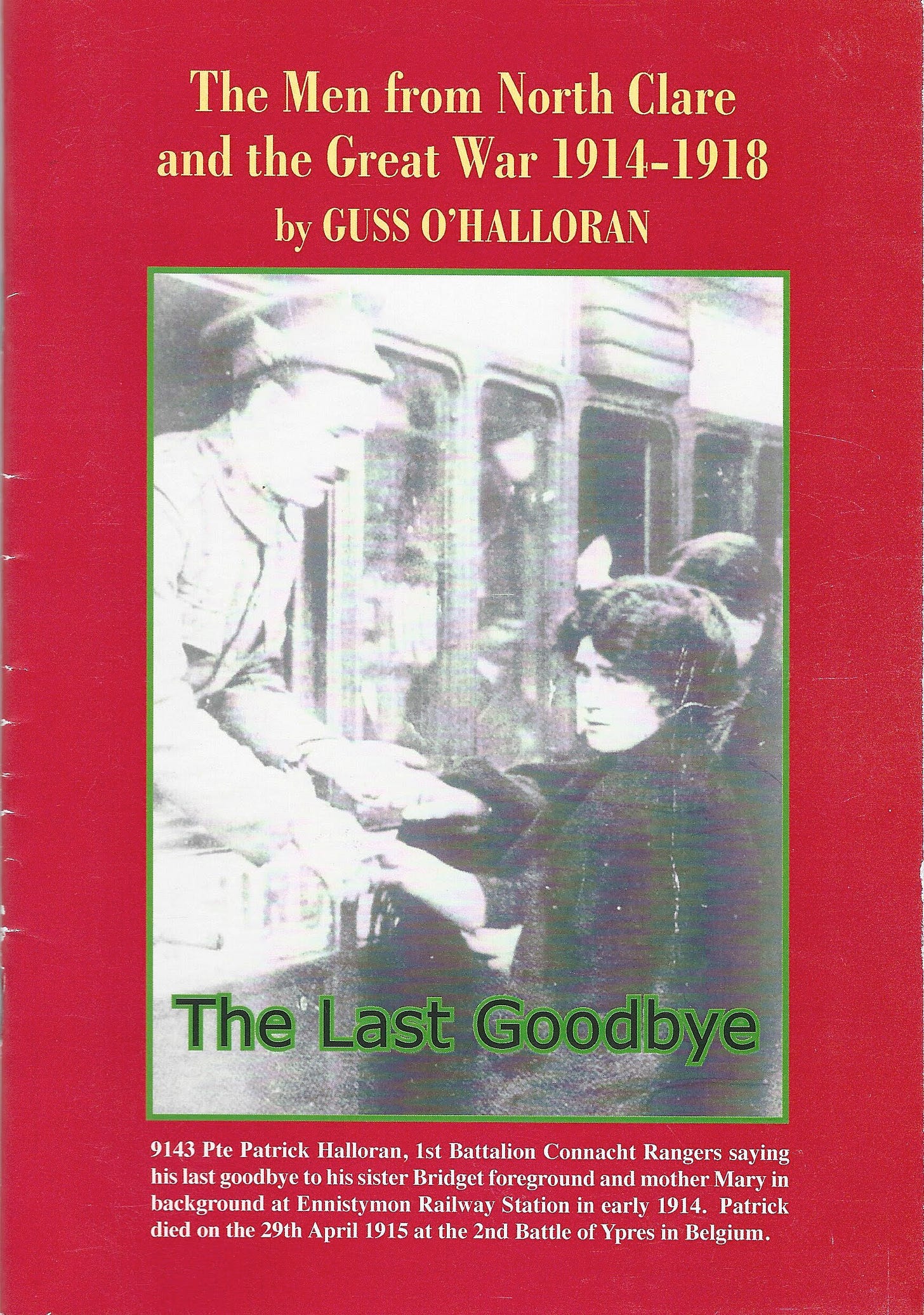 Guss’s pamphlet, The Men from North Clare and the Great War 1914-1918, has a photograph on the cover, a copy of which my mother had hanging in her living room. It is of Private Patrick O’Halloran saying goodbye to his sister Bridget and mother Mary at Ennistymon Railway Station in 1914. Patrick died the following year at the Second Battle of Ypres. It’s an intensely moving image. Patrick’s sister Bridget looks so sorrowful as Patrick holds both of her hands, looking straight at her while she turns her gaze away. Perhaps she could not bear to say goodbye. What is also remarkable is how alike Guss and Patrick were. I can’t quite work out the relationship, as Guss only gives Patrick’s date of death in the pamphlet. I think he was our great-great uncle.